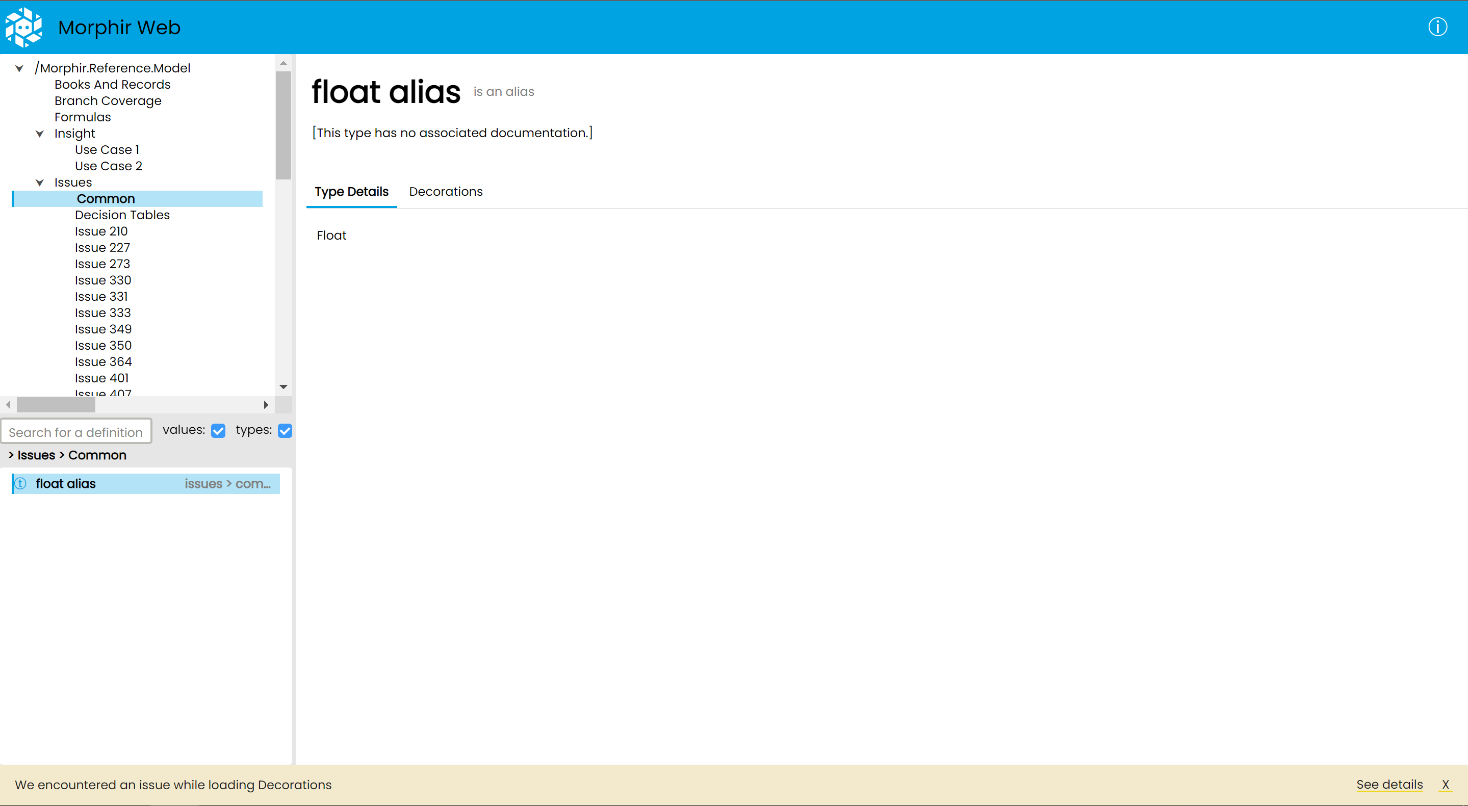 Warnings indicate that loading or saving some data (like test cases or decorations) has failed, however the core functionality of browsing the Moprhir model still works. Click on the See Details link on the bottom right to see a technical explanation.