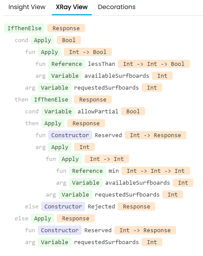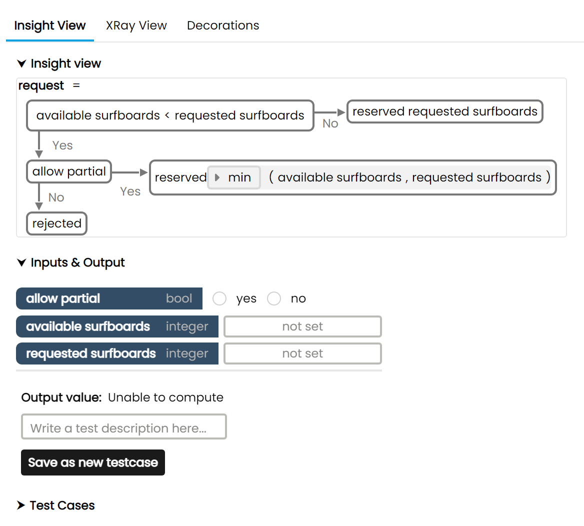 Below is an example of a function describing an algorithm which determines if we have enough surfboards to rent, first in Insight view, then in Xray view.